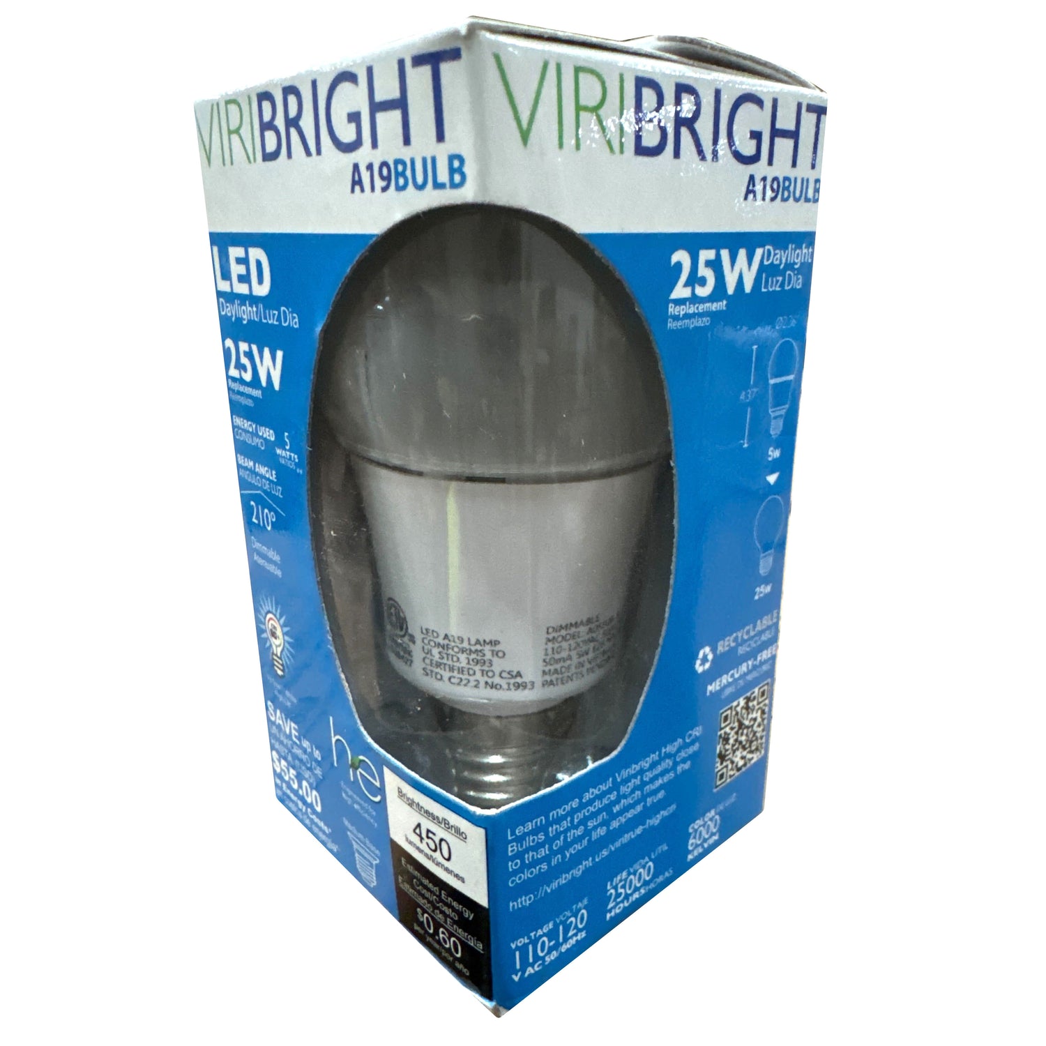Designed for versatility, the Viribright 5W A19 LED bulb is an energy-saving replacement for 25W incandescent lamps, perfect for residential, office, and commercial use. Its dimmable functionality gives you full control over brightness, while the frosted lens ensures smooth, glare-free light distribution. With a 210° beam angle, this bulb fills the room with uniform daylight brightness, making it ideal for task lighting, kitchens, or workspaces. Built for long-lasting performance with up to 15,000 hours of use, the Viribright A19 bulb is eco-friendly, mercury-free, and UL certified for safety and reliability.